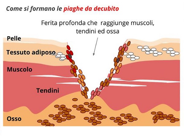 Con il termine di piaghe da decubito, o ulcere da decubito, intendiamo generalmente quelle che, più precisamente, dovrebbero essere definite lesioni da pressione (o da compressione): si tratta di lesioni della pelle e dei tessuti che, a differenza delle escoriazioni e delle ferite superficiali, interessano non solo gli strati superficiali della pelle, ovvero l’epidermide e il derma ma anche gli strati sottocutanei e, nei casi più gravi, la muscolatura e le ossa.